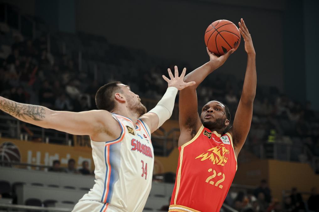 2024年12月26日,廣廈隊球員卡爾頓(右)在比賽中投籃。新華社記者 江漢 攝