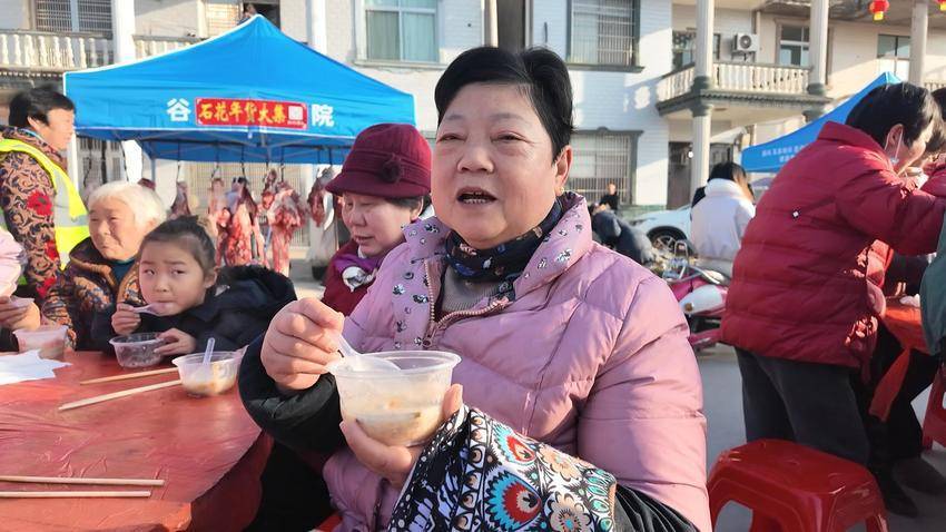 隨著勺子的不停攪拌,粥香彌漫,情暖人心。歷經(jīng)兩個(gè)多小時(shí),一鍋鍋臘八粥新鮮出爐,香氣撲鼻,色澤誘人,口感軟糯。居民們圍坐在圓桌旁,手捧熱粥,笑意盈盈,甜意從舌尖直抵心間。
