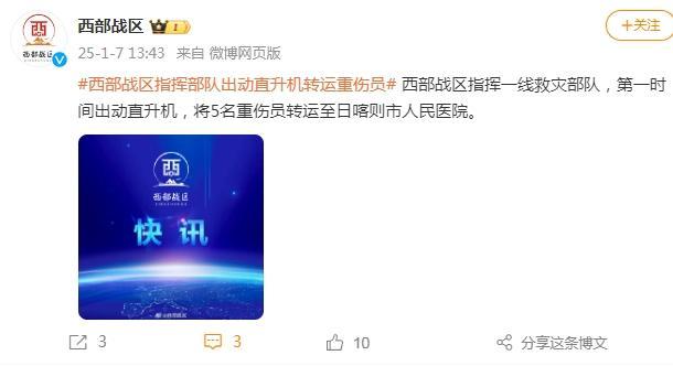 中新網1月7日電 據西部戰區微博消息,1月7日9時5分,西藏日喀則市定日縣發生6.8級地震,震源深度10千米。西部戰區指揮一線救災部隊,第一時間出動直升機,將5名重傷員轉運至日喀則市人民醫院。