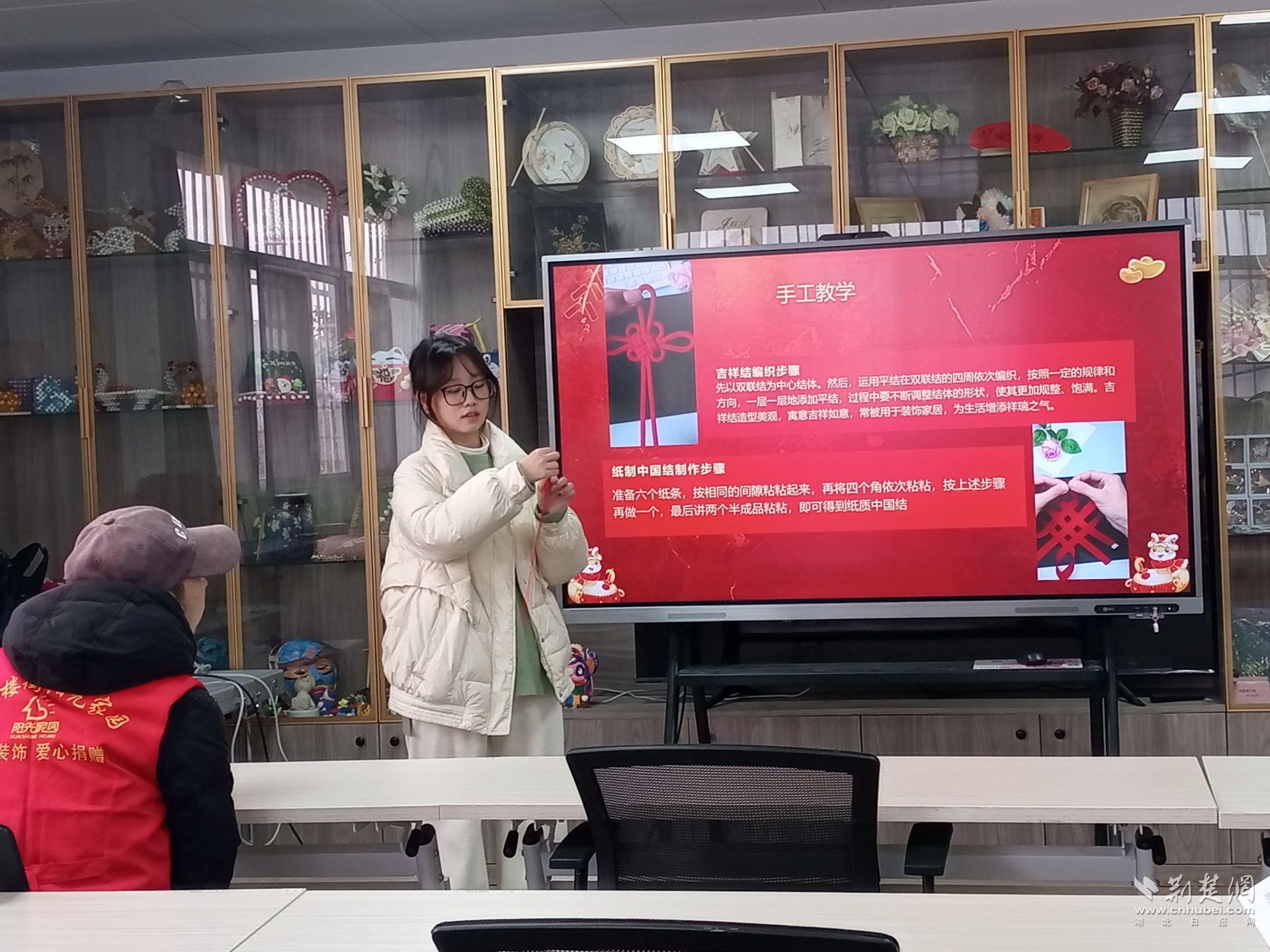 活動伊始,青年志愿者用生動鮮活的話語為大家講解了中國結的文化內涵。“中國結是中華民族傳統手工藝品,一個個精巧的繩結蘊含著吉祥如意、團結美好的寓意,承載著人們對生活的美好祈愿。”