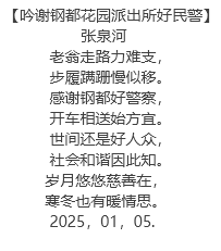 本以為事情已經告一段落,沒想到張爹爹當晚就即興創作了一首詩并轉交給民警,為鋼都花園派出所民警輔警的暖心幫助點贊。