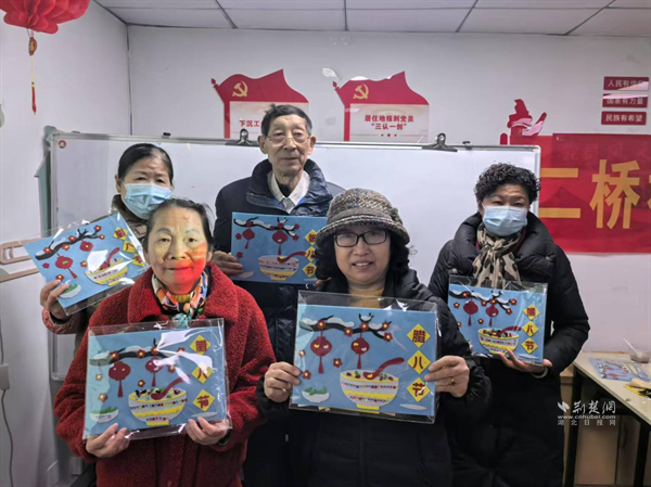 二橋社區聯合溫馨家園助老服務中心開展臘八節活動,邀請30余位老年居民參與。現場,社區工作人員帶領老人用彩紙、剪刀等工具,DIY出一幅幅富有創意臘八節手工貼畫。隨著香氣四溢的臘八粥出鍋,老人們喝著熱騰騰的臘八粥,臉上全是滿足的笑容。工作人員還將臘八粥打包,送到堅守在工作崗位上的環衛工人手中,與他們一同分享這份節日的溫暖。