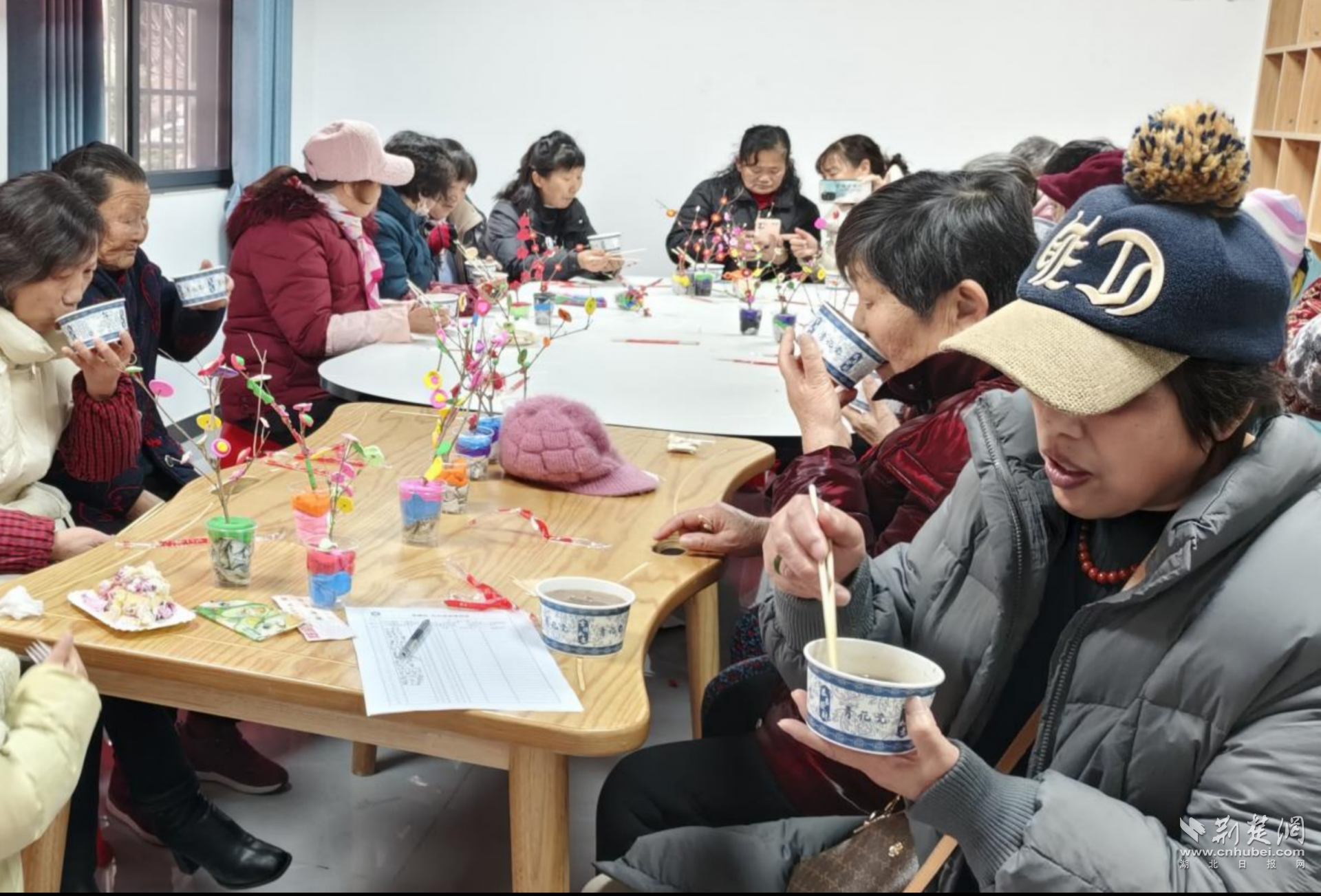 當天,社區老年人服務中心舉辦了一場溫馨而歡樂的臘八節主題的生日宴。當月過生的老年居民們圍坐在一起,一邊品嘗著熱氣騰騰的臘八粥,一邊嘮著家常,現場氣氛溫馨融洽。生日宴上,社區還精心準備了一節枯枝梅花手工體驗課,為生日宴增添了一份藝術氣息。