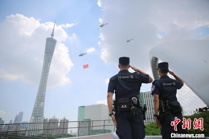 2024年國慶前夕,廣州警方最新入列的H175警務(wù)直升機(jī)在廣州市區(qū)懸掛國旗飛行。廣東省公安廳 供圖