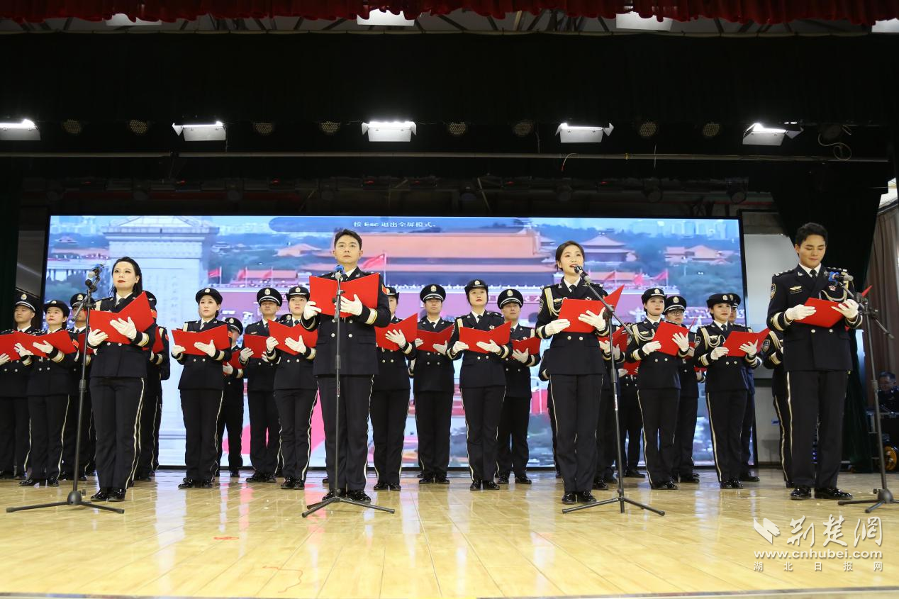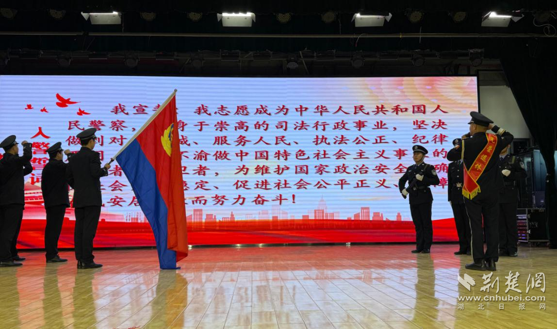 在全體民警嘹亮的人民警察之歌的歌聲中,2024年新錄民警朝氣蓬勃、英姿颯爽,目光堅定有力,他們從榮休民警代表皮軍同志的手中接過警旗,警旗迎風招展、熠熠生輝,全體民警迎著警徽莊嚴宣誓:獻身于崇高的司法行政事業,對黨忠誠、服務人民、執法公正、紀律嚴明,為維護社會大局穩定、促進社會公平正義、保障人民安居樂業而努力奮斗。