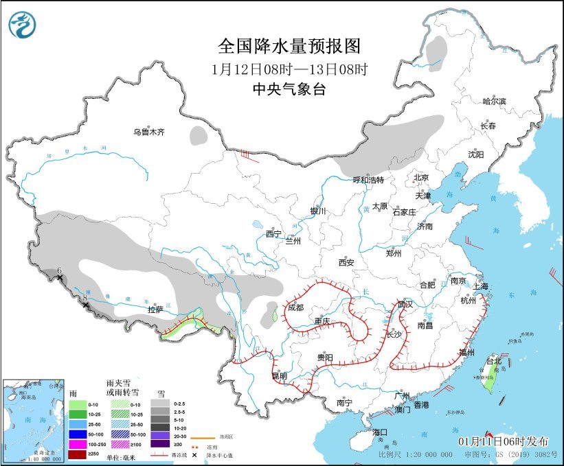 1月12日08時至13日08時,西藏大部、川西高原北部、內蒙古中部等地部分地區有小到中雪或雨夾雪,其中,西藏南部等地局地有大雪。西藏大部、內蒙古西部部分地區有6~7級風。