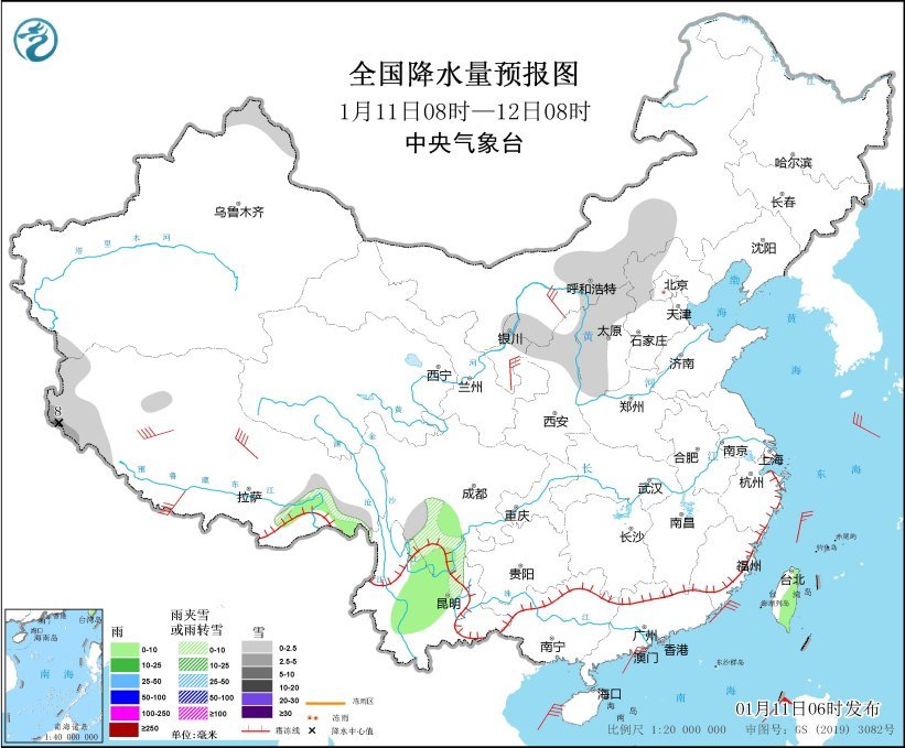 1月11日08時至12日08時,新疆北疆北部、西藏西南部、寧夏北部、陜西北部、山西西部和北部、內蒙古中部、河北西北部、四川南部、云南東北部等地部分地區有小到中雪或雨夾雪。云南中部、臺灣島東部等地部分地區有小雨。西藏大部、寧夏、陜西北部、內蒙古中西等地部分地區有5~6級風,陣風7~8級。