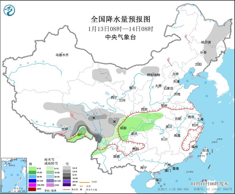 1月13日08時至14日08時,西藏東部、青海南部、川西高原、云南西北部、黑龍江東部、吉林中東部等地部分地區有小到中雪或雨夾雪,其中,西藏東南部、云南西北部等地局地有大雪。四川盆地大部、陜西南部、湖北西部、西藏東南部等地部分地區有小雨,其中,西藏東南部等地部分地區有中雨。內蒙古東北部和中部等地部分地區有4~6級風,其中,西藏北部和南部等地部分地區有6~7級風。