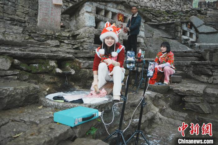 2025年1月,年輕人在煥河村的古井邊直播。周燕玲 攝