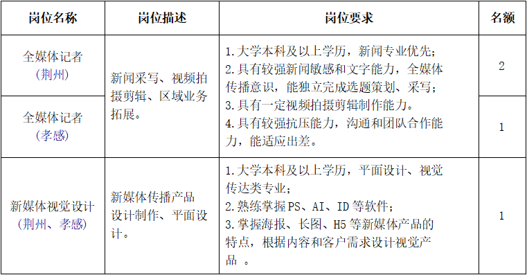 根據事業發展需要,荊楚網漢江分公司擬面向社會公開招聘工作人員4名。現就相關事項公告如下:
