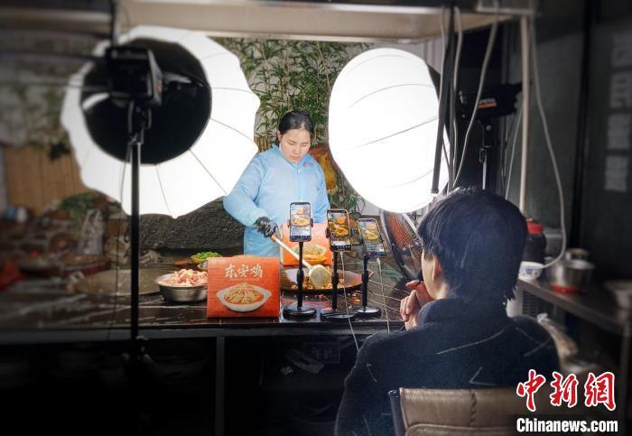 村民在直播銷售非遺美食東安雞。唐濤華 攝