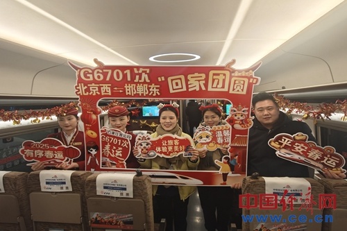 旅客與列車工作人員在車廂合影。中國經(jīng)濟網(wǎng)記者 佟明彪/攝