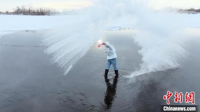游客在“不凍河”體驗潑水成冰?!∪~兵 攝