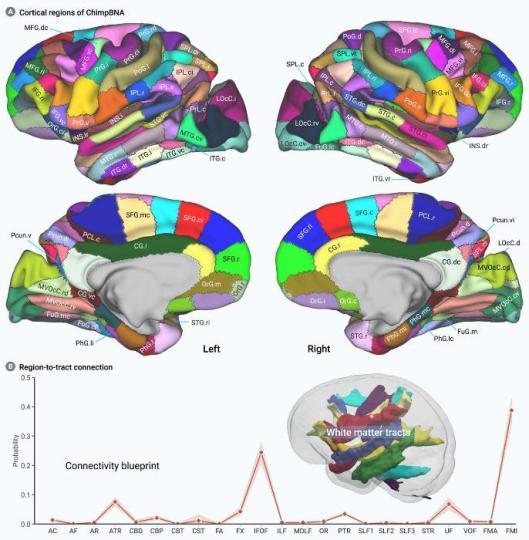研究結(jié)果表明,黑猩猩腦網(wǎng)絡(luò)組圖譜揭示了與人類(lèi)大腦皮層顯著不同的連接模式,特別是在外側(cè)顳葉和背外側(cè)前額葉皮層。這些差異與大腦皮層擴(kuò)張的模式不同,表明大腦皮層演化中的連接性變化可能比之前認(rèn)為的更為復(fù)雜和微妙。