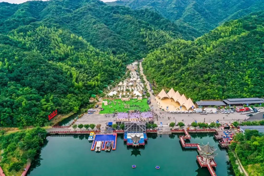 游客在永州市陽明山萬和湖畔,體驗露營、觀星空的趣味。