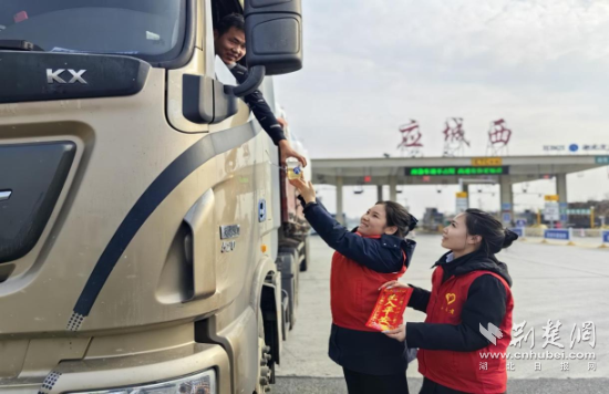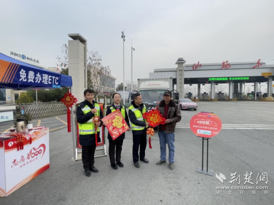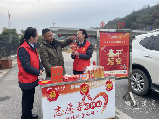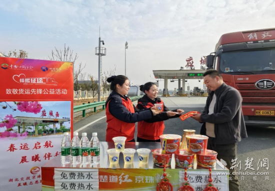 應城西收費站服務臺旁,熱水、方便面、水果茶、礦泉水等物資整齊擺放,志愿者們滿臉笑容地與司機們交流互動,宣傳差異化收費政策,并將一個個飽含新春祝福的“福”字裝飾品遞到司機手中。