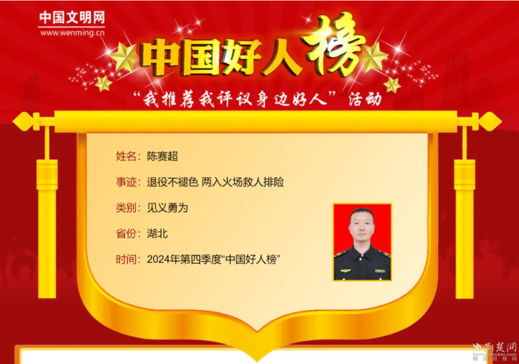 荊楚網(湖北日報網)訊(記者胡小軍 通訊員肖杰)1月15日,2024年第四季度“中國好人榜”發布,黃岡市陳賽超光榮上榜。