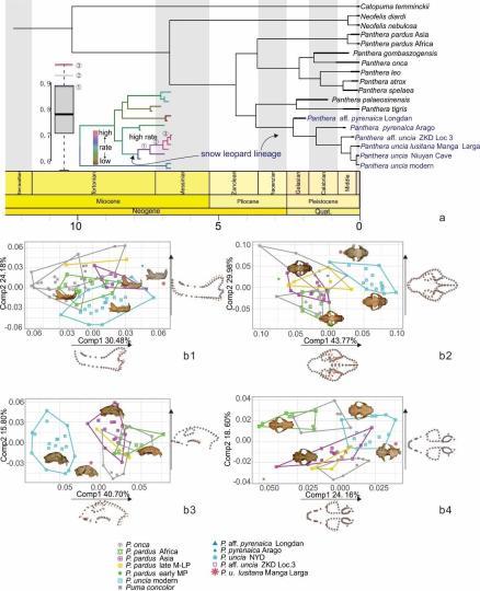 研究團隊將上述現生雪豹形態與功能的對應關系,同化石雪豹進行對比研究發現,早期的雪豹包括早更新世早期甘肅龍擔的似比利牛斯雪豹、法國的比利牛斯雪豹,下頜骨雖然聯合部已較為陡直,但仍沒有縮短,頰齒也沒有增大,對應對羊亞科獵物的初步適應,但尚未有明顯高寒環境的特化。