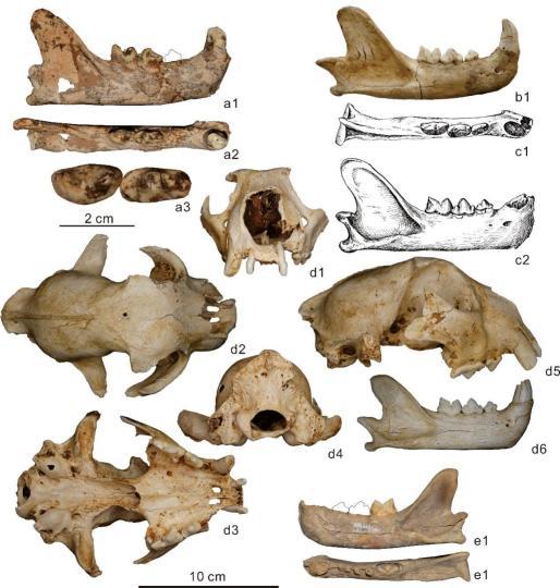 亞歐大陸的雪豹化石:a.甘肅龍擔;b.法國Arago;c.北京周口店第三地點;d.葡萄牙Manga Larga;e.北京門頭溝牛眼洞。中國科學院古脊椎所 供圖