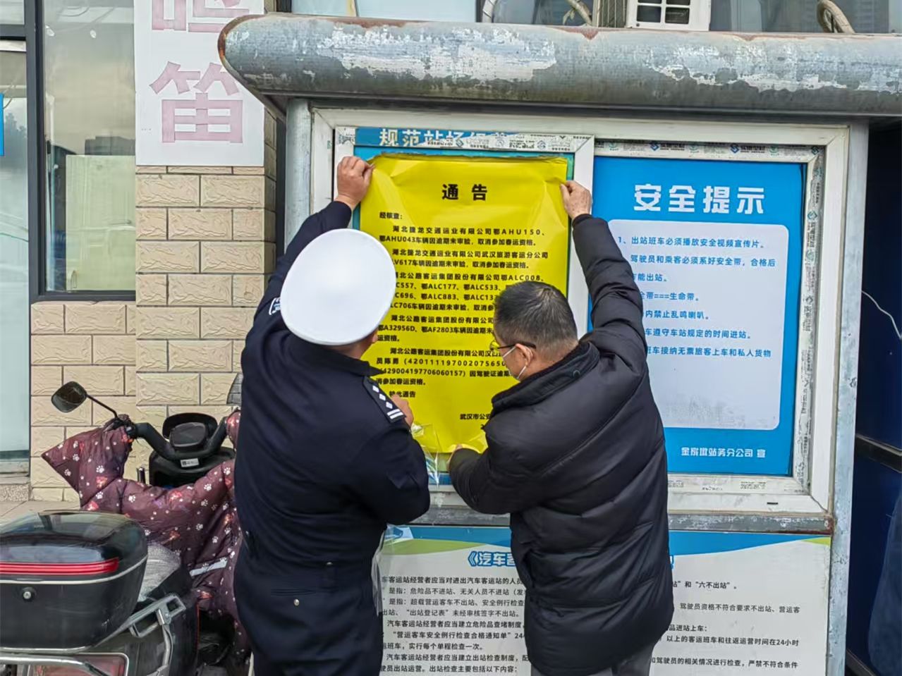 1月15日上午10時,武昌區交通大隊民警來到宏基客運站,仔細檢查站內車輛,并叮囑司機:“出車前一定要做好全面檢查,提醒乘客全程系好安全帶。”在青年路客運站,江漢交警將隱患車輛和駕駛員進行黃榜公示,嚴禁其上路。