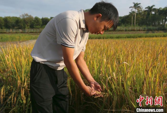 圖為2024年11月9日在海南儋州,中國熱科院品資所賀治洲博士在查看“品香優智15”雜交稻長勢。記者 王曉斌 攝