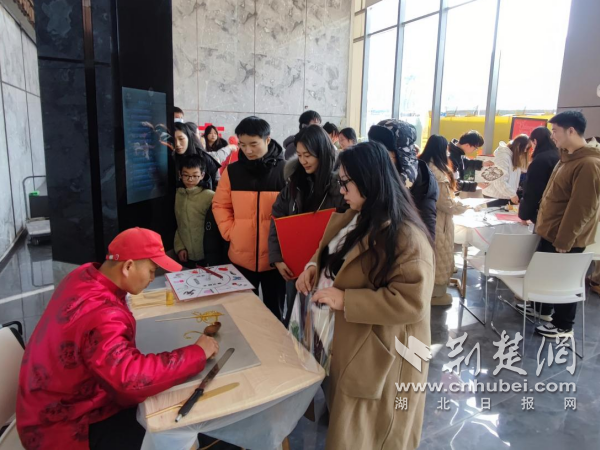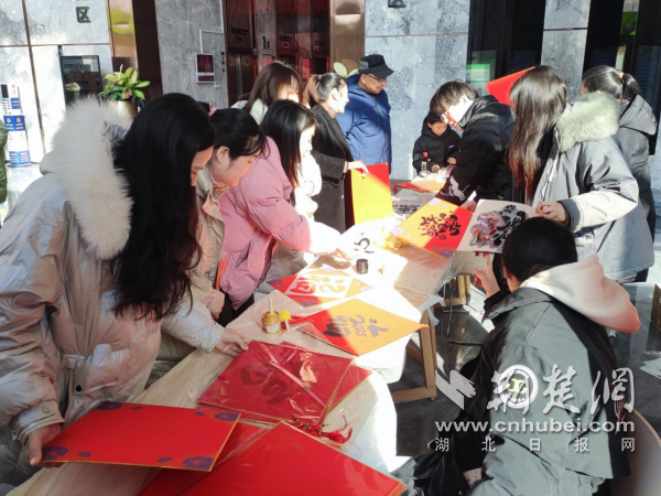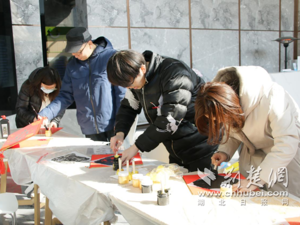 現(xiàn)場氣氛熱烈而歡快。“我要蛇年暴富的拓印!”“給我來一張財神圖!”……對于那些不擅長書法的白領(lǐng)們而言,制作拓印年畫作品是一個很好的選擇。大家精心挑選出心儀的圖案模板,蘸取墨汁或金粉,全神貫注地投入到拓印之中。而書法愛好者們則興致勃勃地拿起毛筆,在紅色卡紙上揮毫潑墨,書寫不同字體的“福”字,他們筆下的 “福” 字各具神韻,有的筆鋒剛勁有力,有的字體圓潤飽滿。寫罷,再系上喜慶的中國結(jié),一幅幅飽含新春祝福的作品便呈現(xiàn)在眾人眼前,盡顯書法藝術(shù)的獨特魅力。