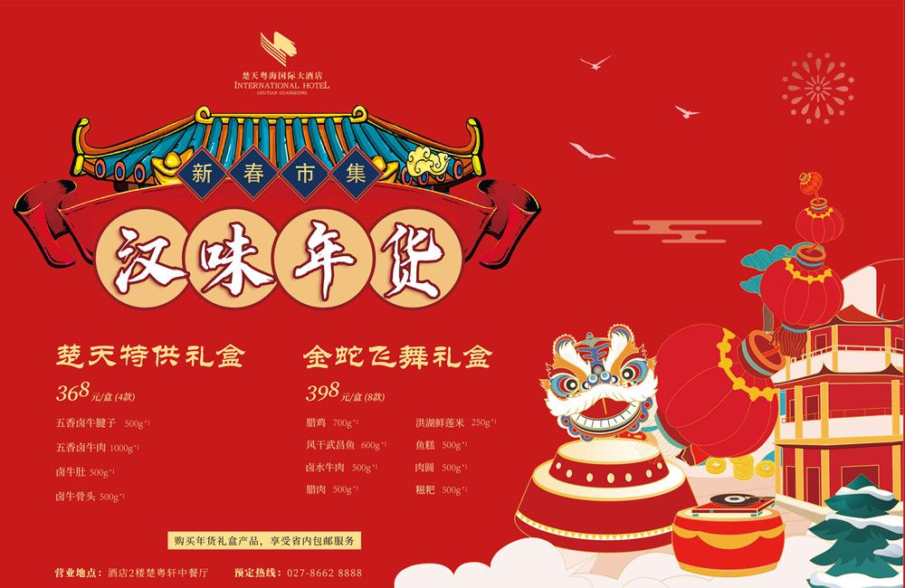 新春將至,武漢的街巷都掛起紅燈籠,為春節準備年貨已進入了倒計時!楚天粵海國際大酒店今年新春特別推出“金蛇飛舞臘味禮盒”“楚天特供牛肉禮盒”兩款春節禮盒,為團圓大餐添美味。