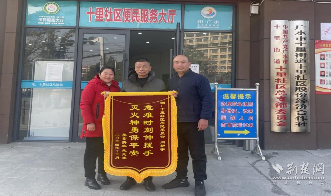 荊楚網(湖北日報網)訊(通訊員 倪婕)近日,一面印有“危難時刻伸援手 滅火神勇保平安”的錦旗被朱先生夫妻送至廣水市十里社區居委會,以此向退役軍人闕新宇表達深深的感激之情。原來,闕新宇曾在他們家中突發火情時挺身而出,成功將火勢撲滅,其英勇行為直至朱先生送錦旗才被眾人知曉。