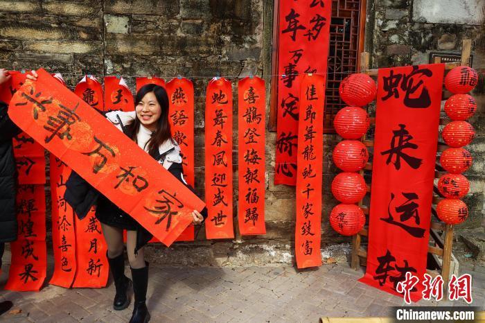 沿著蜿蜒的青石板路前行,書法愛好者揮毫潑墨,為游客書寫充滿祝福的春聯(lián)。一位游客高興地說:“手寫的春聯(lián)更有年味,一筆一畫里都是對新年的美好期許。”皮影戲表演區(qū),《哪吒鬧海》火熱開打;不遠(yuǎn)處的木偶戲、斗雞表演也吸引了不少游客駐足觀看。