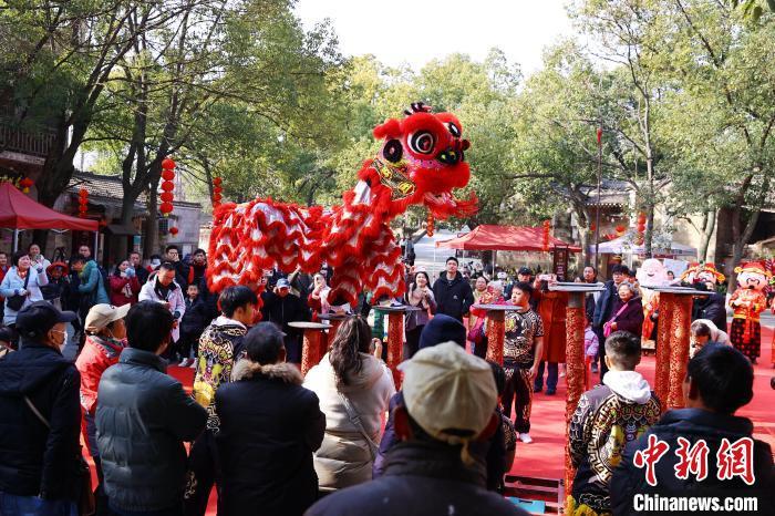 1月18日,游客在大余灣古村觀看舞獅表演。 中新社記者 張暢 攝