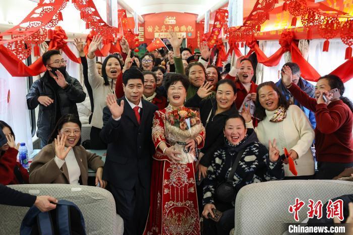 1月18日,從貴陽站開往玉屏站的5640次列車上,舉行金婚紀念的一對夫妻和旅客合影。 中新社記者 瞿宏倫 攝