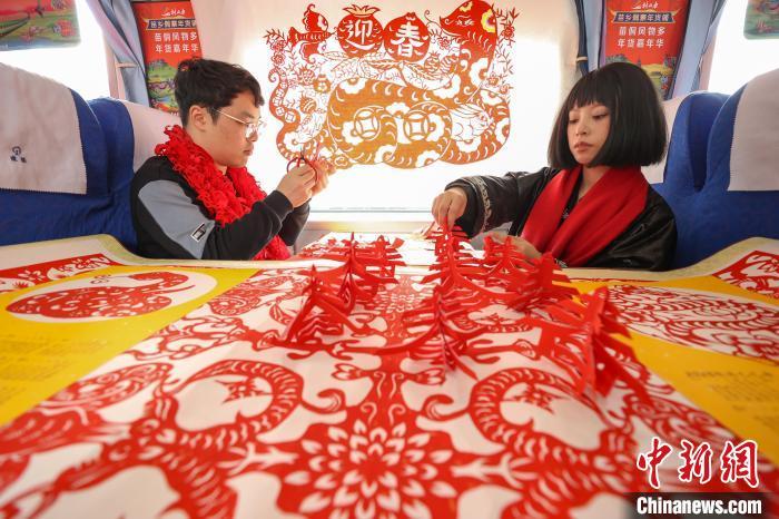 車廂的另一頭,從小就熱愛剪紙的“Z世代”青年林千遜,與好友開始展示起苗族剪紙。劃、折、剪,1分30秒,林千遜就能剪好一個立體的“春”字,4個小時里他剪了三四百個“春”字免費送給旅客。