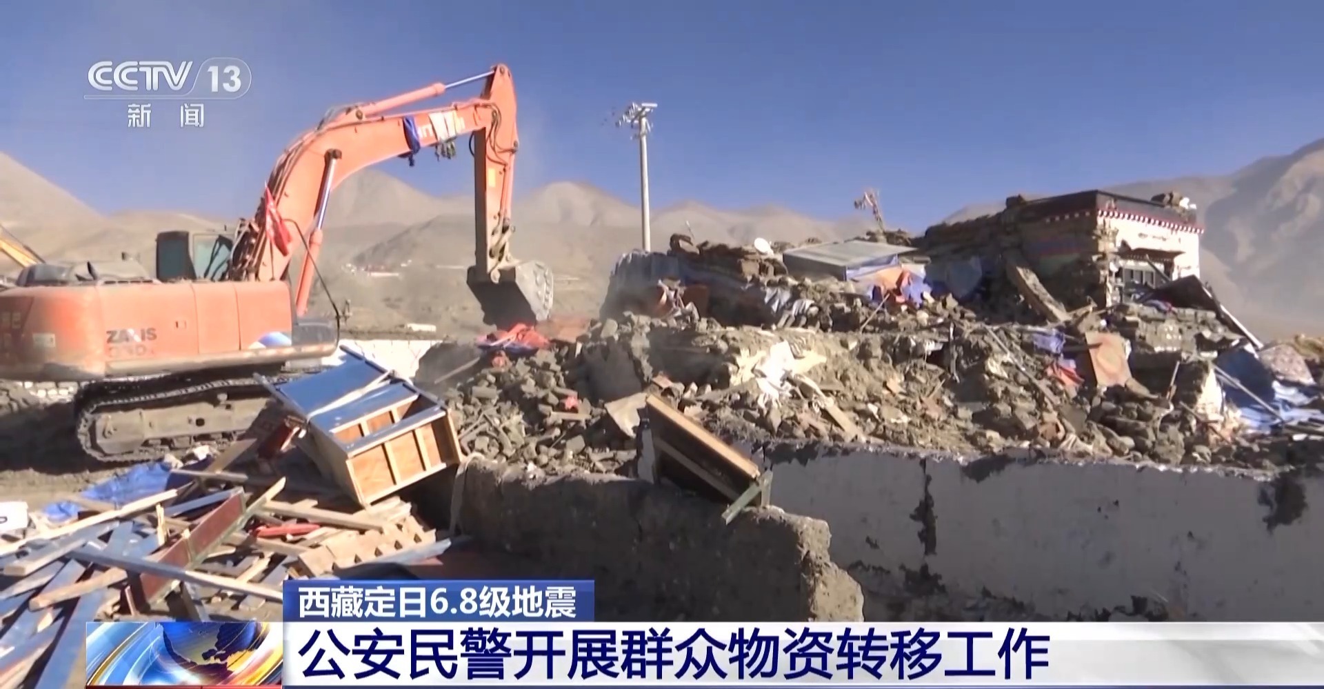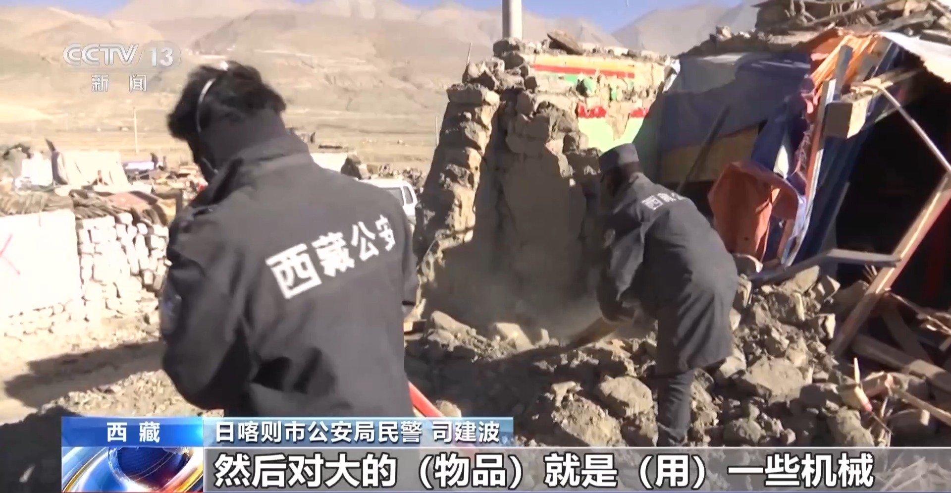 日喀則市公安局民警 司建波:人力加機械結合起來進行挖掘。對于一些比較貴重的小物件物品,民警只能徒手去挖,在廢墟里面去找。對大的物品就用一些機械把墻體挖開后,我們直接搬。