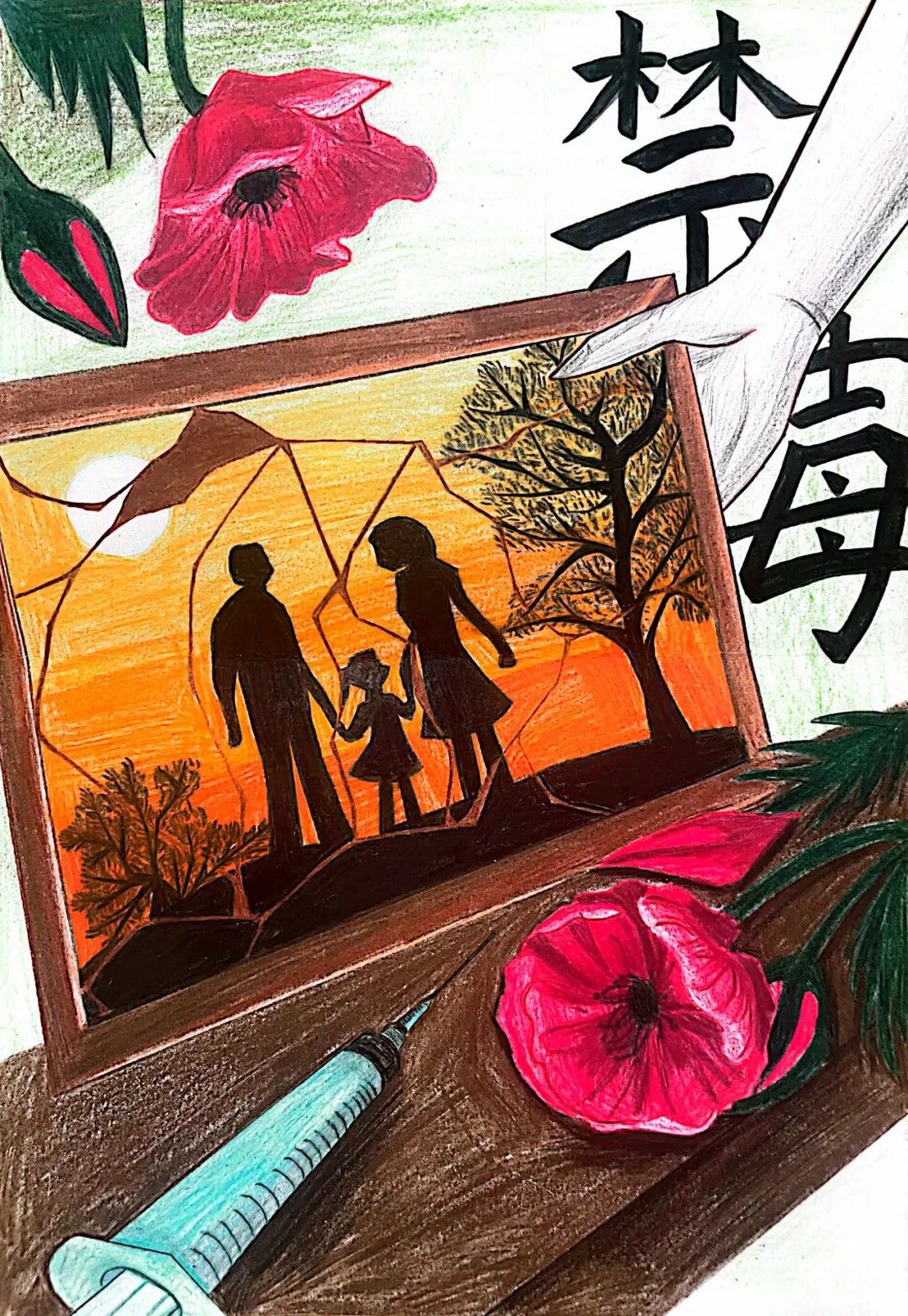 繪畫組中,來自魯巷實驗小學的楊姝然同學的作品色彩鮮艷,充滿童趣,整幅畫通過生動的形象和細膩的筆觸,顯示出了孩子們對毒品的堅決抵制;華中師范大學附屬保利南湖小學黃振辰同學則通過破碎的畫框、紅色罌粟花、注射器等元素,結合醒目的“禁”字,深刻傳達了毒品對家庭的危害。