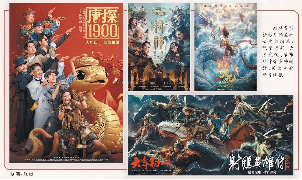 蛇年春節檔影片涵蓋神話史詩動畫、探案喜劇、古裝武俠、軍事動作等多種題材,圖為部分新片海報。 制圖:張繼