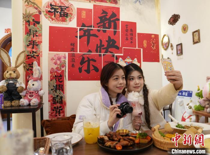 1月18日,湖南長沙一餐廳推出“高顏值”新年套餐,年輕消費(fèi)者正在店內(nèi)打卡就餐。 李盈 攝