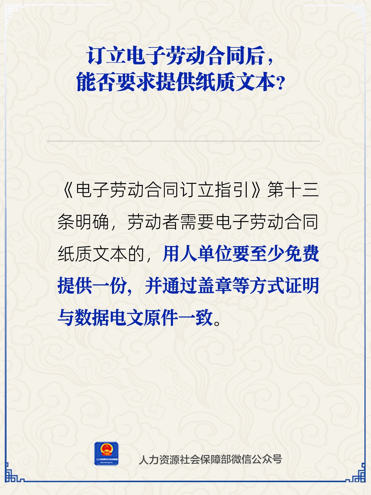 中新網1月20日電 據人力資源和社會保障部微信公眾號消息,訂立電子勞動合同后,能否要求提供紙質文本?就這一問題,人力資源和社會保障部回應稱,《電子勞動合同訂立指引》第十三條明確,勞動者需要電子勞動合同紙質文本的,用人單位要至少免費提供一份,并通過蓋章等方式證明與數據電文原件一致。