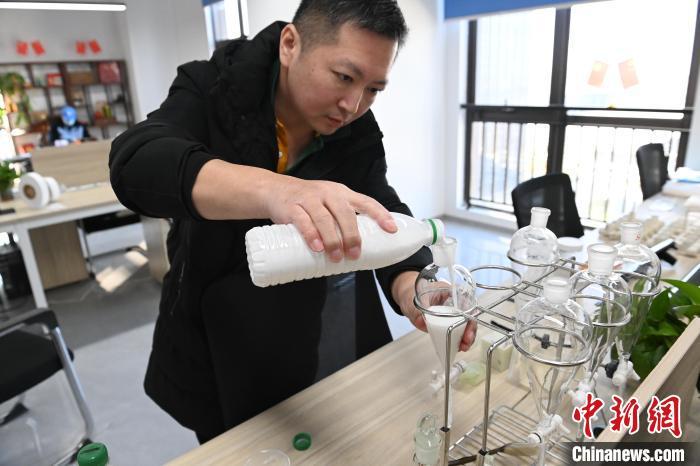圖為1月11日,陳閔富正在展示方解石粉體材料。中新網記者 蔣雪林 攝