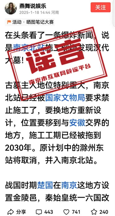 中新網1月21日電 據“南京網絡辟謠”微信公眾號消息,近日,有網民在抖音等平臺發帖稱,南京北站因挖到古墓,“已經被國家文物局要求禁止施工了”“預計停工六個月或以上”“施工工期已經被拖到2030年”等。