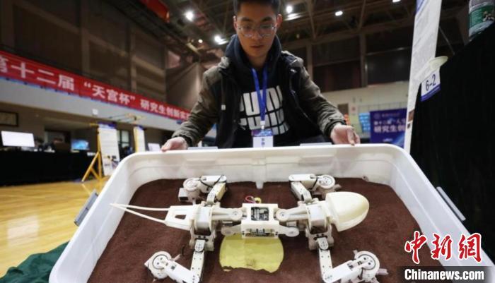 2024年11月17日,在南京航空航天大學第十二屆“天宮杯”研究生創新實驗競賽上,參賽研究生介紹大型空間結構下的兩足爬行機器人的功能。中新網記者 泱波 攝