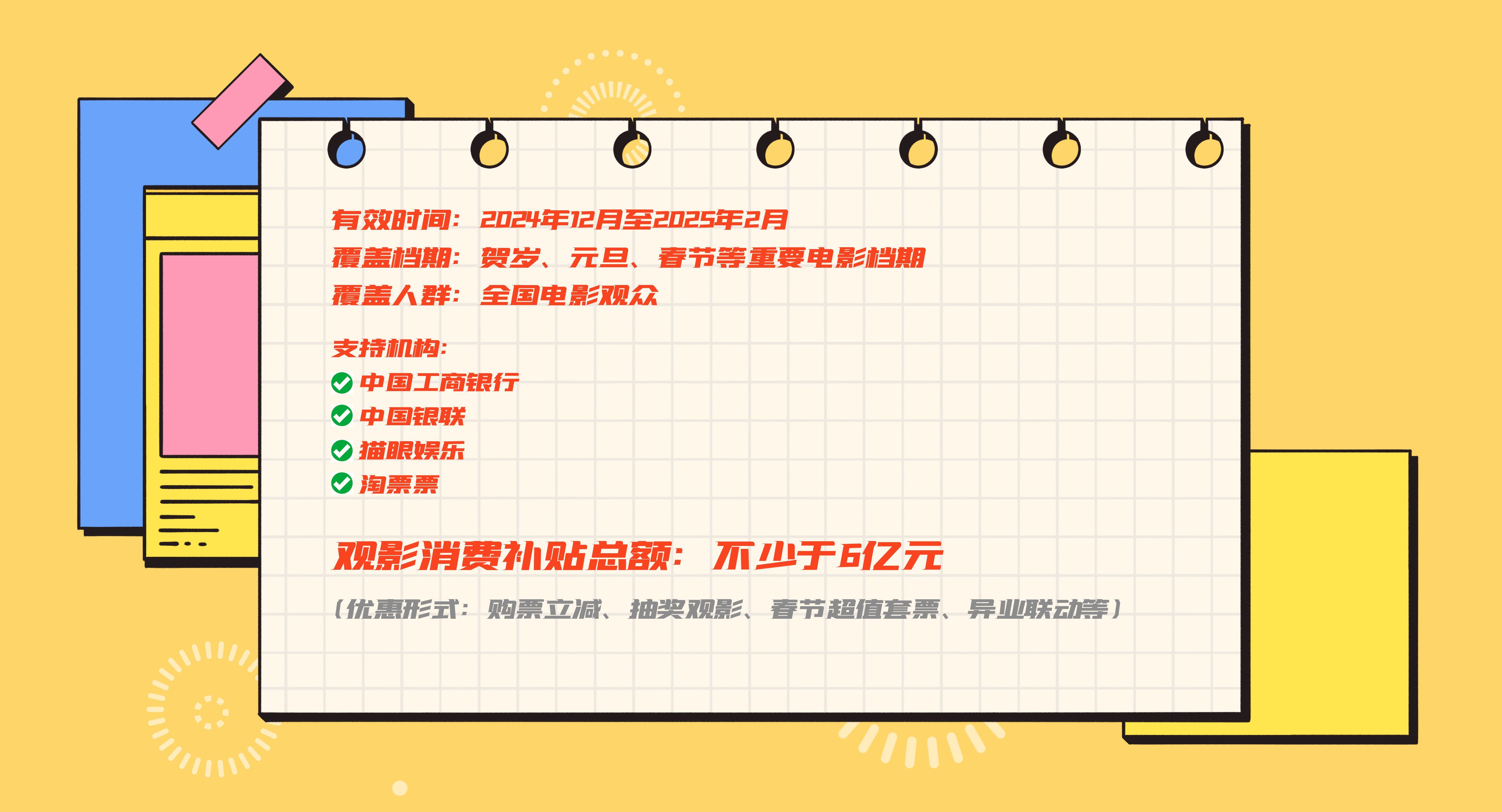 2024年12月9日至2025年2月28日,用戶可通過淘票票App、微信淘票票小程序、支付寶淘票票小程序、淘寶淘票票小程序首頁“全國電影惠民消費季”或“政府補貼”進入活動專題頁領(lǐng)取5—50元紅包,并且同時可享受淘票票買一贈一、淘麥VIP積分禮包、88VIP全年觀影優(yōu)惠券、影迷月活動。