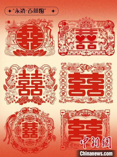 由常德職業技術學院、中央美術學院、北京印刷學院,天津傳媒學院,河北美術學院等高校教師及彭雅玲設計工作室成員等青年設計師共同創作的“永濟·百囍圖”,系國內首套以結婚證為題材的百囍圖,取材于永濟籍在外人士收藏的近2400套自清朝康熙年間以來的結婚證書。據介紹,該作品于2024年10月開始構思并著手創作,歷時三個月并經多次修改創作完成。