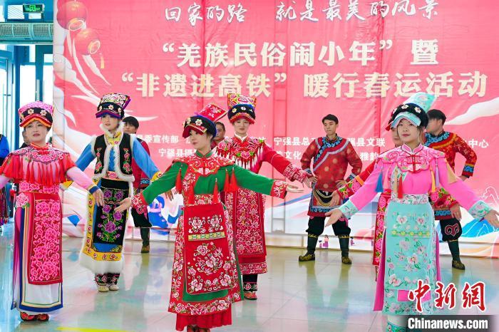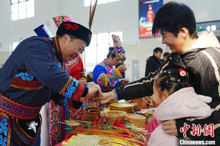 中新網陜西漢中1月22日電 (梅鐿瀧 周茂育 陳燕)1月22日(農歷臘月廿三)是北方小年。當日,在漢中車務段寧強南站內,一場“羌族民俗鬧小年”暨“非遺進高鐵”暖行春運活動吸引了眾人目光。據悉,此次活動既有羌編、羌繡、羌陶等非遺展示,也有羌歌、羌舞等展演,溫暖旅客回家路。