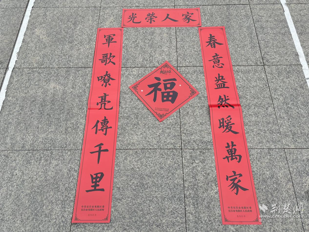 活動(dòng)現(xiàn)場(chǎng),老兵代表們領(lǐng)取了由夷陵區(qū)書法協(xié)會(huì)書法家們書寫的“定制”春聯(lián)。春聯(lián)以關(guān)愛老兵、戰(zhàn)友情、保家衛(wèi)國等內(nèi)容為主。“戍邊守土轅門勇將士,報(bào)國精忠赤膽好家風(fēng)”、“軍歌嘹亮傳千里,春意盎然暖萬家”一句句對(duì)仗工整、寓意深遠(yuǎn)的祝福躍然紙上,既承載著對(duì)戰(zhàn)友奉獻(xiàn)精神的歌頌,又飽含著對(duì)新年新生活的美好期許。
