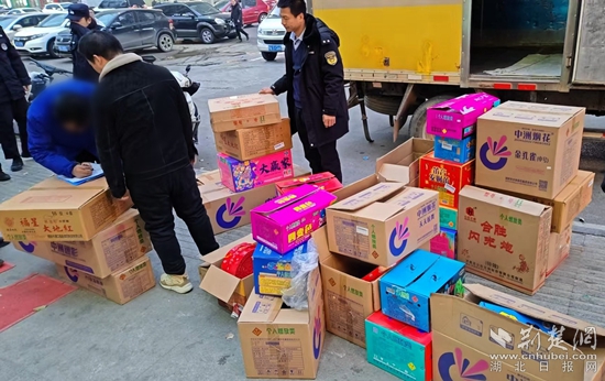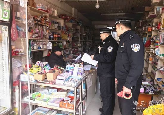 1月14日下午,葛店分局治安部門聯合相關職能部門組成執法組,對街邊商鋪進行檢查,發現某超市內非法經營煙花爆竹,聯合執法組依法對非法存儲的25箱煙花爆竹扣押。