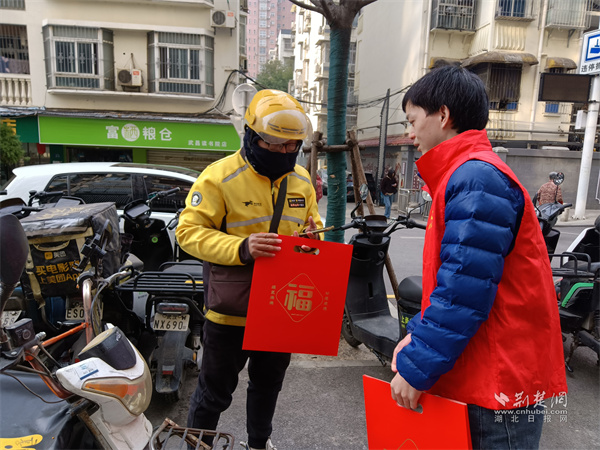 荊楚網(湖北日報網)訊(通訊員 王倩)新春佳節臨近,1月22日,武昌區黃鶴樓街道讀書社區黨委組織社區流動黨員開展志愿暖“新”活動,為轄區新就業群體傳遞節日的溫暖與關懷。