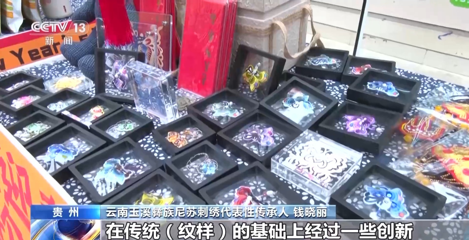 云南玉溪彝族尼蘇刺繡代表性傳承人 錢曉麗:我是從云南過來的,這個蝴蝶胸針也是沿用了我們傳統紋樣,加上設計師的一些設計,從顏色上來講紫色用得比較多,在新的一年寓意紫氣東來。我們開發了七大類上千個產品,在傳統紋樣的基礎上經過一些創新,讓非遺走進人們的日常生活。