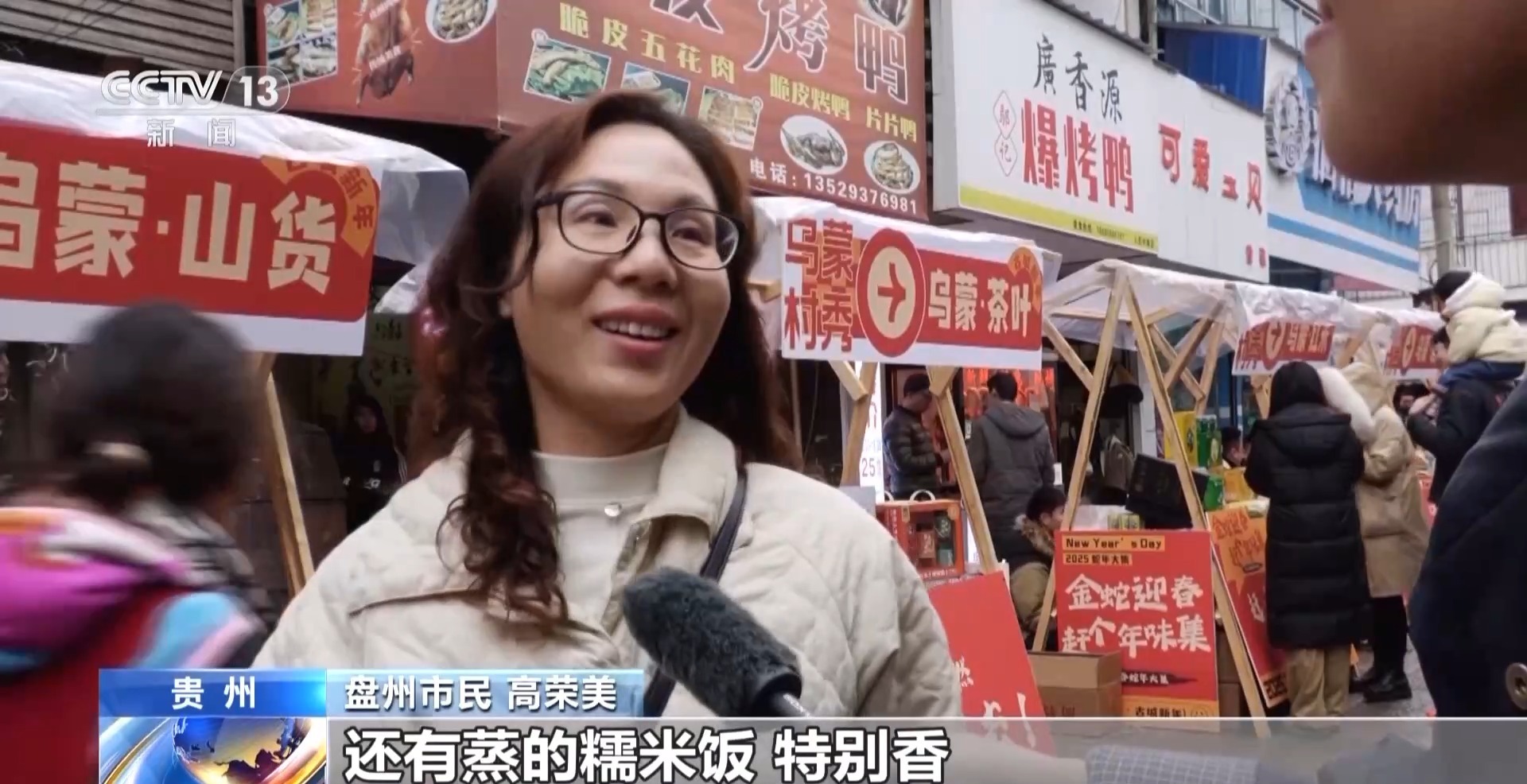 盤州市民 高榮美:來到這個集市,看到很多我們自己家鄉的美食,還有這些我們愛吃的香腸、火腿,還有蒸的糯米飯,特別香,就想買這些東西。