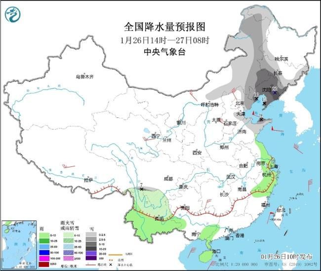 1月26日14時至27日08時,內蒙古中東部、東北地區西北部和中南部、華北中東部、山東中北部、四川南部、云南北部、貴州西北部等地部分地區有小到中雪或雨夾雪,內蒙古東部、遼寧、吉林南部、山東半島北部等地部分地區有大到暴雪,局地大暴雪(20~25毫米)。江淮、江南中東部、云南中南部、華南等地有小雨,云南南部部分地區有中雨(見圖2)。