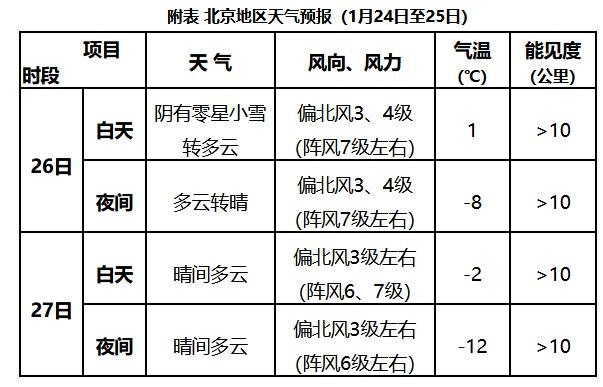 26日白天大部地區有零星小雪,夜間天氣逐漸轉晴。受強冷空氣影響,26-27日有3~4級偏北風,陣風7級左右。該期間氣溫下降,白天最高氣溫1~-2℃,夜間最低氣溫-8~-12℃。